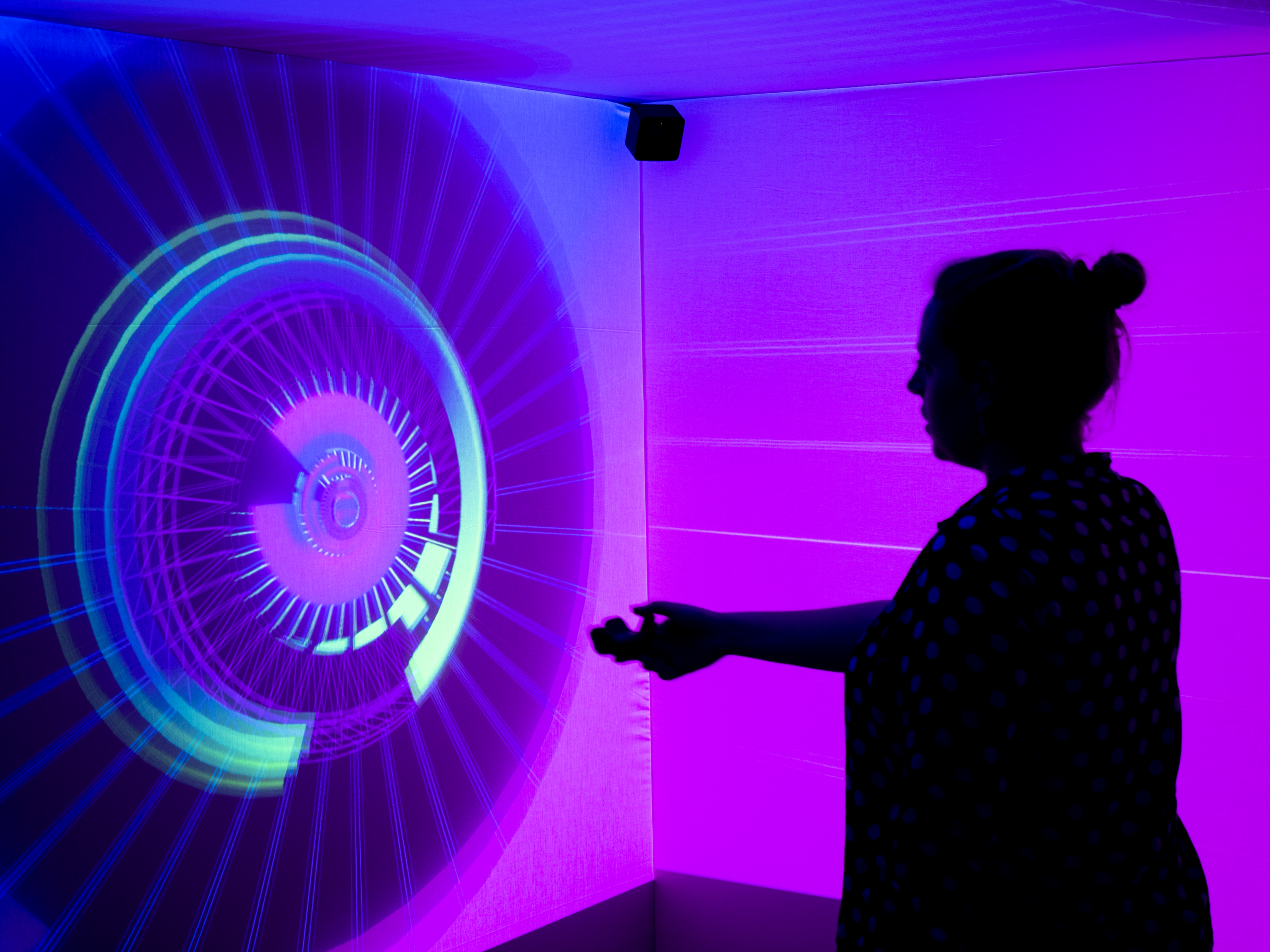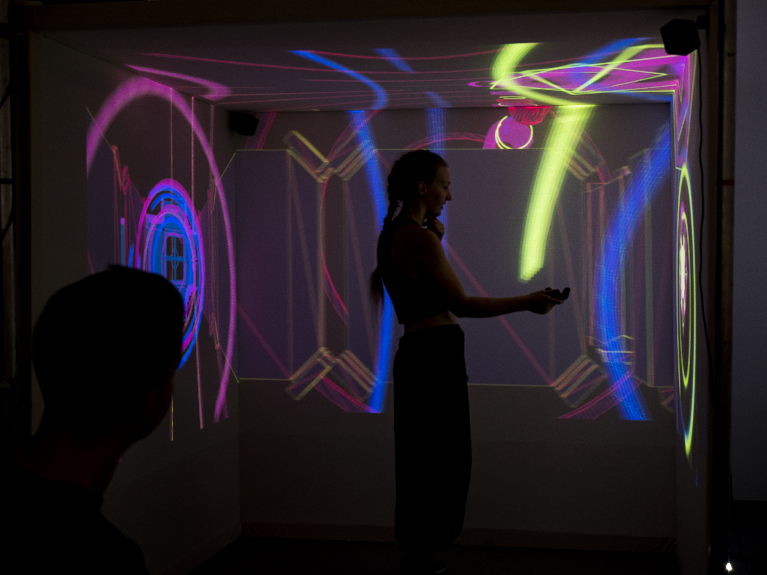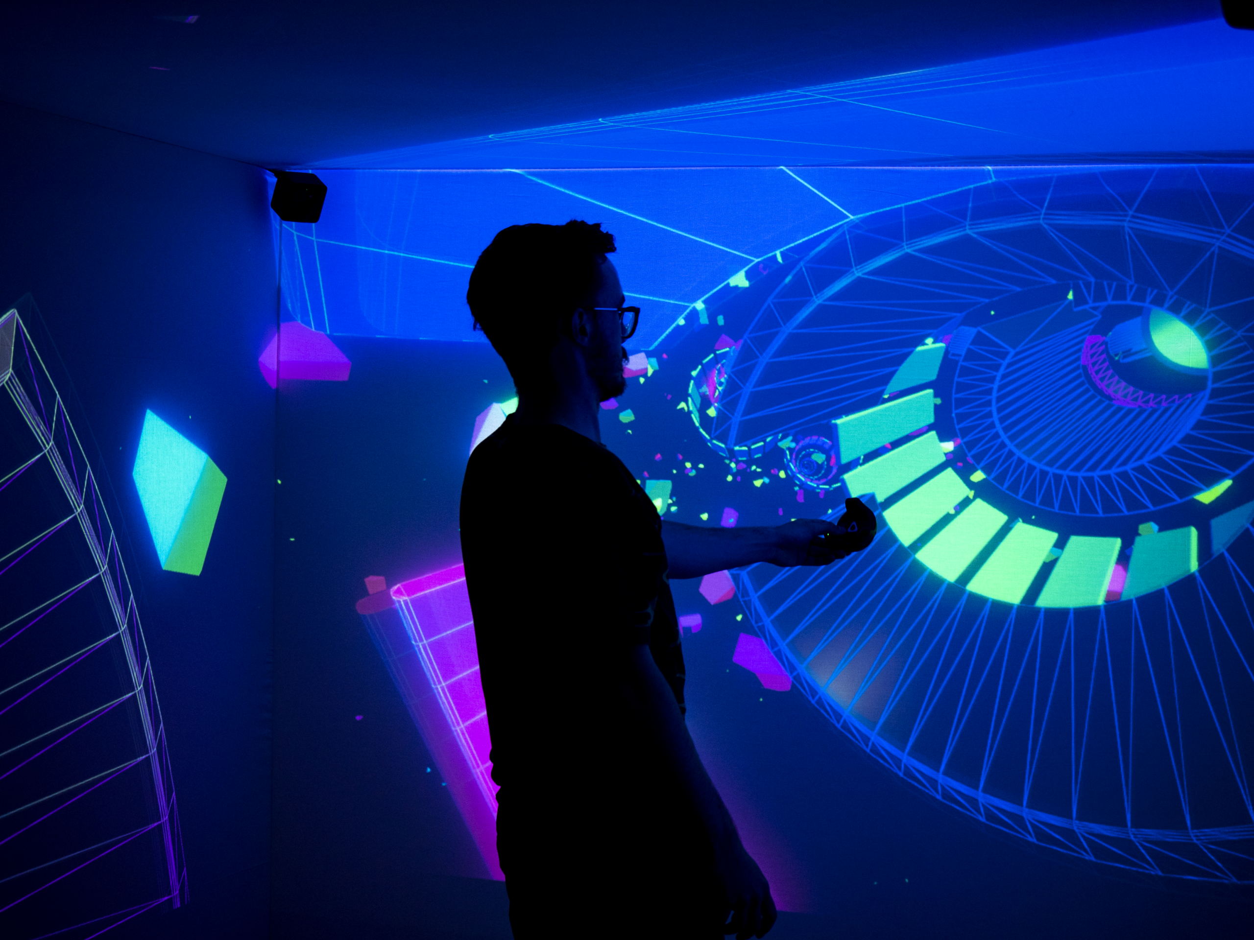Enter the void and explore, what you see. Come into the 2 x 2 x 2 m box and pick up the vive tracker. Enjoy the immersive projection all around you. The tracker will be your representation in the world you see. You can choose between four different levels. Each level focuses on a different type of movement, from very fast pacing to careful movement. You decide how fast you want to go.