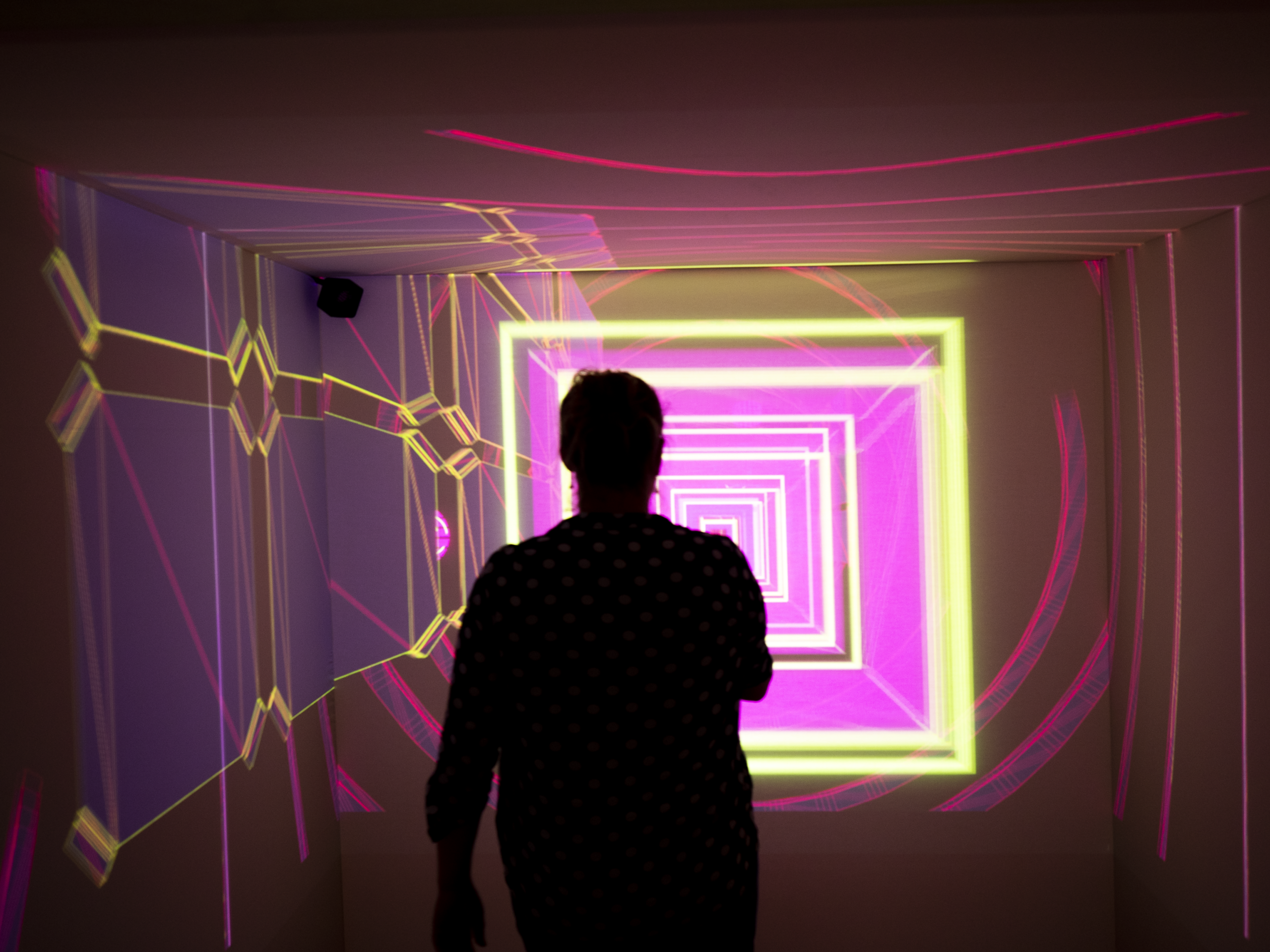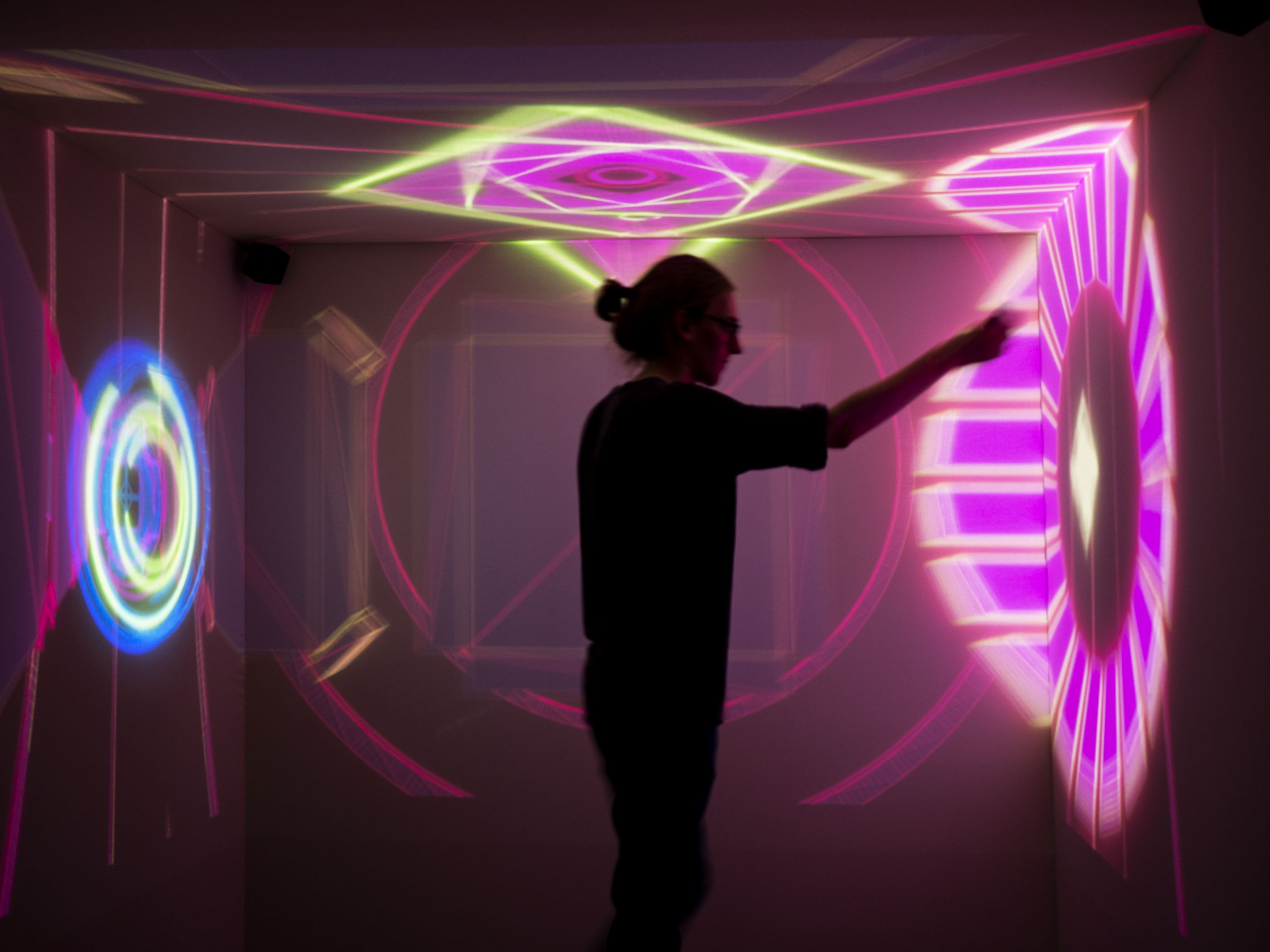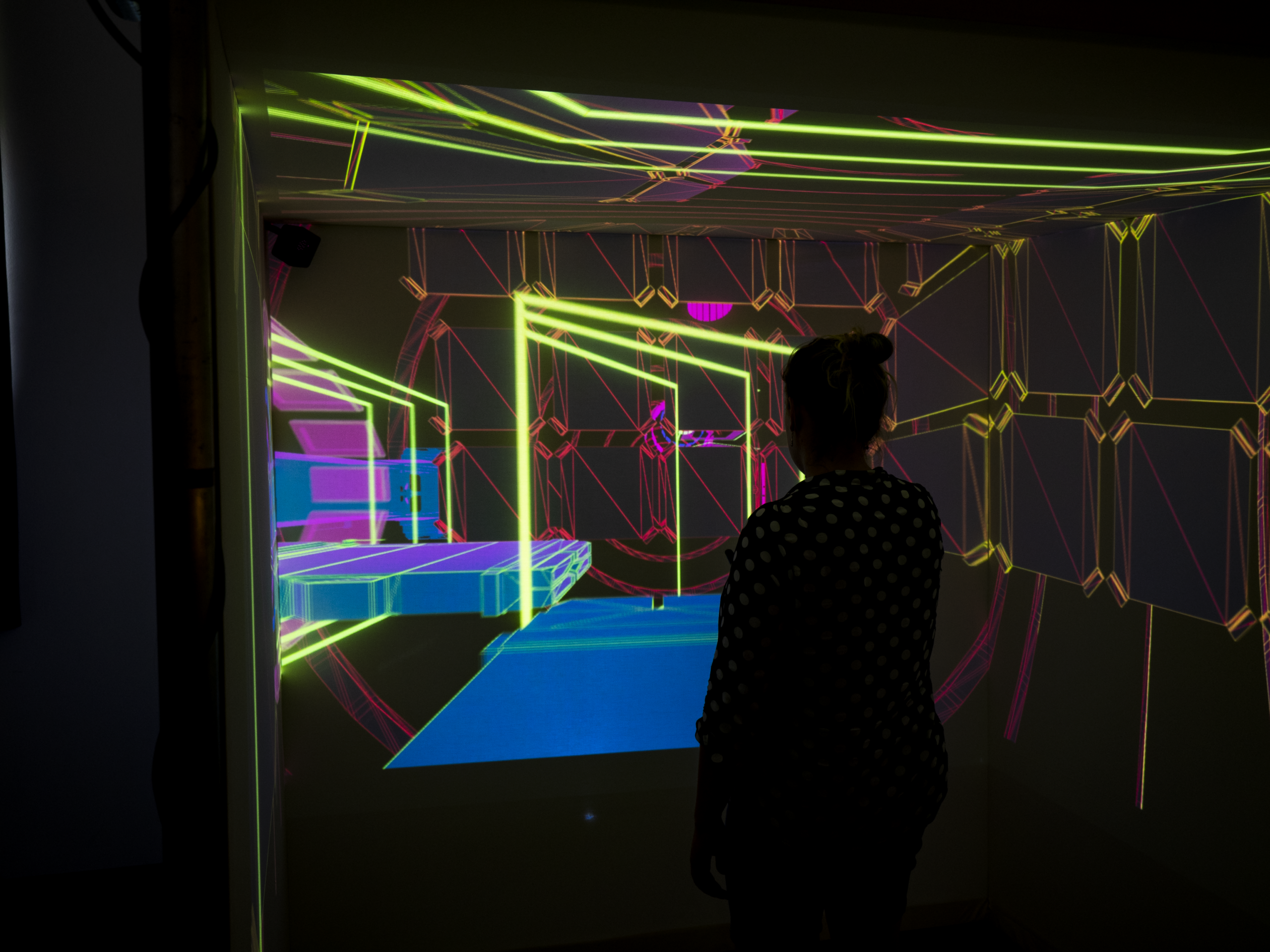 Enter the void and explore, what you see. Come into the 2 x 2 x 2 m box and pick up the vive tracker. Enjoy the immersive projection all around you. The tracker will be your representation in the world you see. You can choose between four different levels. Each level focuses on a different type of movement, from very fast pacing to careful movement. You decide how fast you want to go.