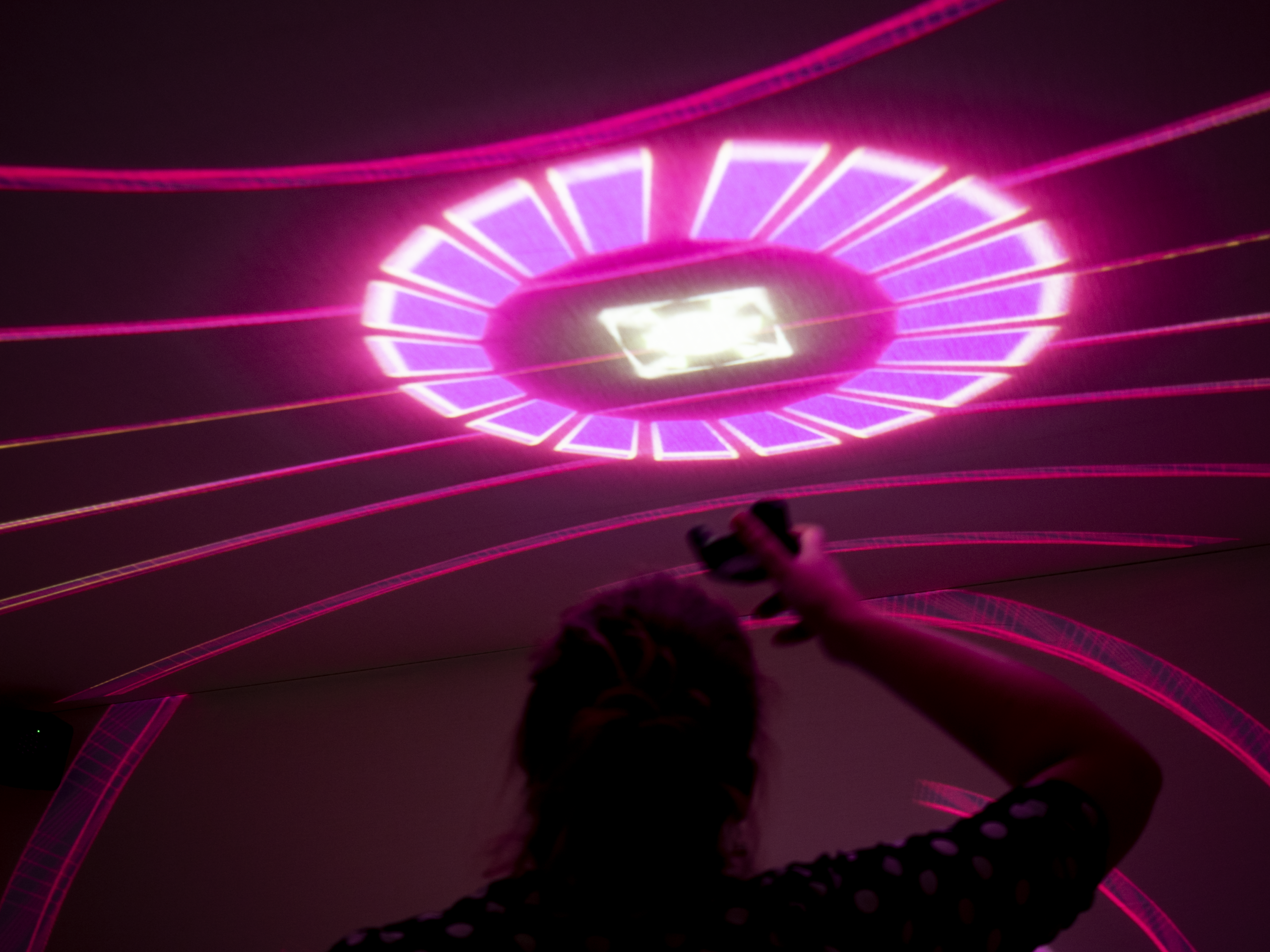 Each level is characterized by different types of movement. In the STUCK level, the player learns the basic movement by moving the controller together with a target surface. In ORIENTATION, the player learns how the movement of the tracker controls his or her own movement in space. MANDALA primarily plays with the perception of perspective of the player. RABBITHOLE turns up the speed and the focus of movement is skill and pacing of your actions. The player receives feedback directly and intuitively from what he sees and hears. We decided to design four experiences instead of just one because the decision for one experience would not have been representative of the setup.